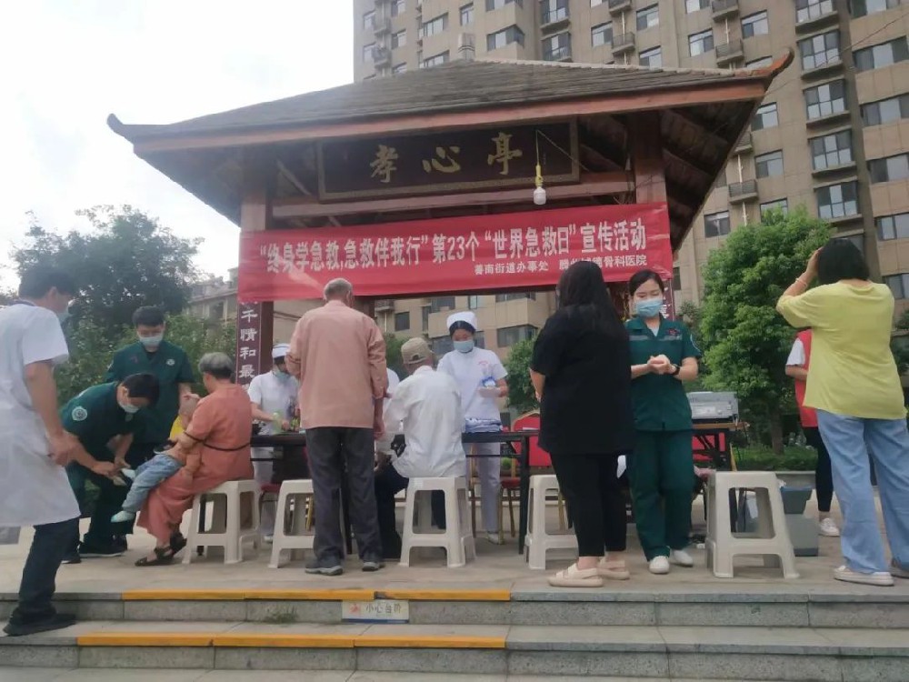 在活動現(xiàn)場,集團醫(yī)護人員為群眾測量血壓、對基礎(chǔ)病和骨病的進行診斷,并采用現(xiàn)場演練的形式,為大家詳細講解心肺復(fù)蘇白金十分鐘的急救流程和操作步驟,并利用人體模型現(xiàn)場進行心肺復(fù)蘇模擬演示;為現(xiàn)場群眾、師生詳細講解外傷包扎、骨折固定、氣道異物梗阻急救法,手把手指導(dǎo)大家進行心肺復(fù)蘇和氣道異物梗阻急救法練習(xí),群眾、師生們學(xué)習(xí)熱情高漲,紛紛上前練習(xí),醫(yī)護人員手把手指導(dǎo)每個人急救操作細節(jié),確保了此次急救技能培訓(xùn)效果;利用宣傳單頁、電子屏宣傳急救知識。