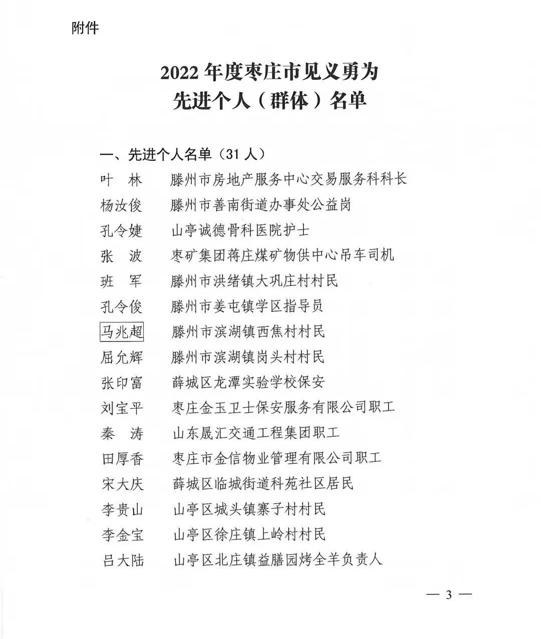 2月27日,在中共棗莊市委“平安棗莊”建設(shè)暨政法工作會(huì)議上,市委政法委、市見(jiàn)義勇為基金會(huì)印發(fā)表彰決定,對(duì)李金寶等34名同志進(jìn)行表彰獎(jiǎng)勵(lì),授予李金寶等31名同志“棗莊市見(jiàn)義勇為先進(jìn)個(gè)人”稱號(hào);授予韓風(fēng)等3名同志“棗莊市見(jiàn)義勇為先進(jìn)群體”稱號(hào)。其中,山亭誠(chéng)德骨科醫(yī)院護(hù)士孔令婕被授予“棗莊市見(jiàn)義勇為先進(jìn)個(gè)人”榮譽(yù)稱號(hào)。