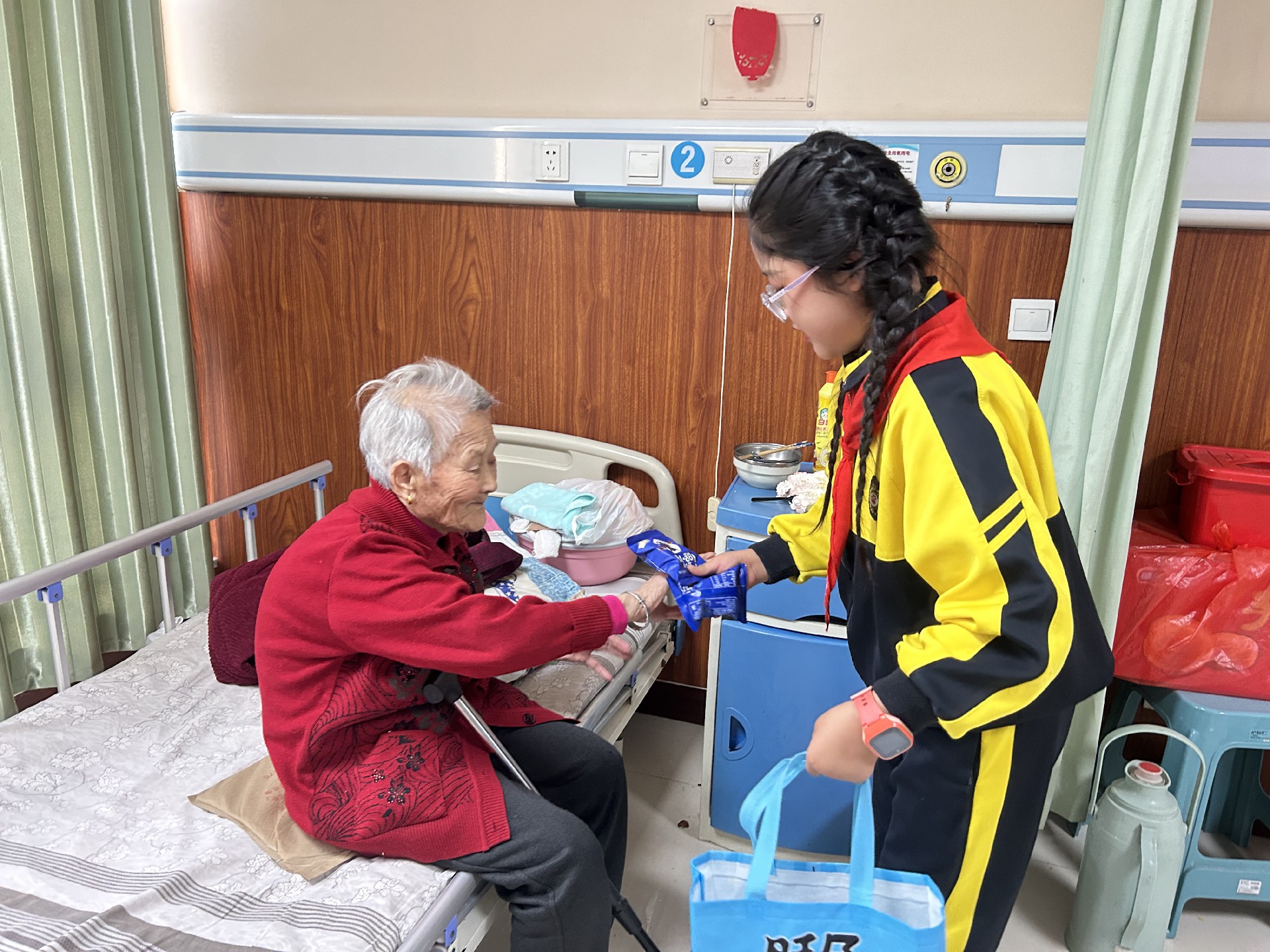文藝表演結(jié)束后,與會(huì)人員向老人們獻(xiàn)上了節(jié)日蛋糕,學(xué)生們紛紛用自己的行動(dòng)敬老愛(ài)老。